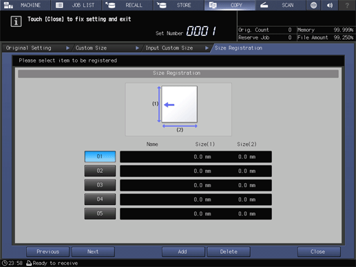 Screen access | Touch panel - [COPY] - [Original Setting] - [Custom] - [Input Size] - [Size Registration] | ||
