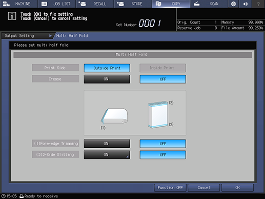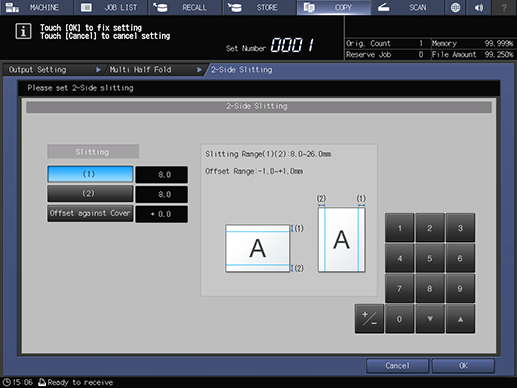Setting items | [ON] | Slits both edges of the paper. [Slitting] and [Offset against Cover] are available. | |