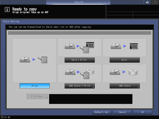 Control panel - Utility/Counter - [User Setting] - [Initial Setting] - [Copy Initial Setting] - [Store Setting]