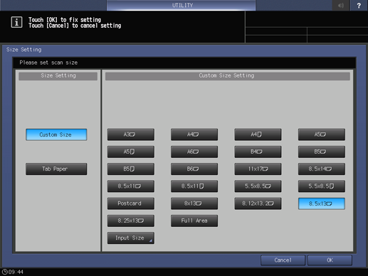 Control panel - Utility/Counter - [User Setting] - [Initial Setting] - [Scan Initial Setting] - [Size Setting]