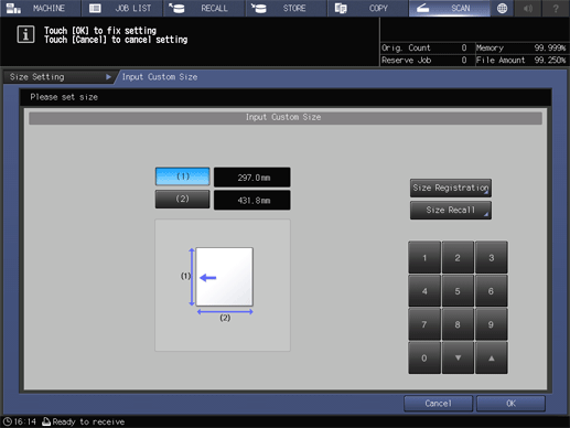 Control panel - Utility/Counter - [User Setting] - [Initial Setting] - [Scan Initial Setting] - [Size Setting] - [Custom Size] - [Input Size] | |||