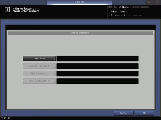 Control panel - Utility/Counter - [User Setting] - [Change Password]