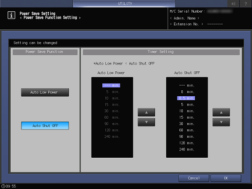 Control panel - Utility/Counter - [Administrator Setting] - [System Setting] - [Power Save Setting] - [Power Save Function Setting]