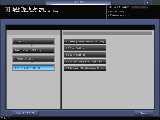 Control panel - Utility/Counter - [Administrator Setting] - [System Setting] - [Weekly Timer Setting]