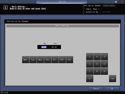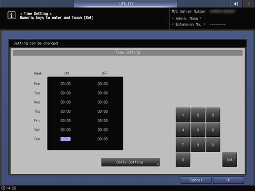 Screen access | Control panel - Utility/Counter - [Administrator Setting] - [System Setting] - [Weekly Timer Setting] - [Time Setting] | ||