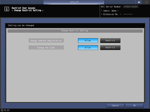 Control panel - Utility/Counter - [Administrator Setting] - [System Setting] - [Restrict User Access] - [Change Restrict Setting]
