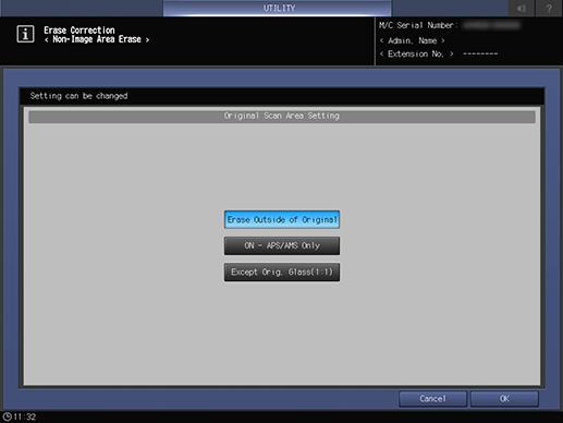 Screen access | Control panel - Utility/Counter - [Administrator Setting] - [System Setting] - [Expert Adjustment] - [Erase Correction] - [Non-Image Area Erase] | ||