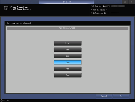 Screen access | Control panel - Utility/Counter - [Administrator Setting] - [System Setting] - [Expert Adjustment] - [Erase Correction] - [ADF Frame Erase] | ||