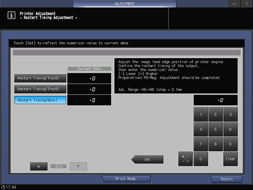 Screen access | Touch panel - [MACHINE] - [Adjustment] - [Machine Adjustment] - [Printer Adjustment] - [Restart Timing Adjustment] | ||