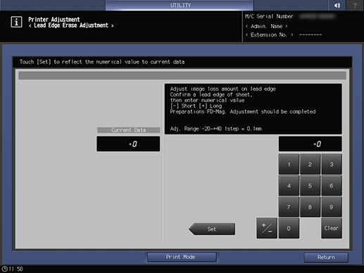 Screen access | Control panel - Utility/Counter - [Administrator Setting] - [System Setting] - [Expert Adjustment] - [Printer Adjustment] - [Lead Edge Erase Adjustment] | ||