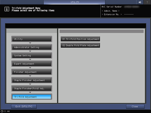 Control panel - Utility/Counter - [Administrator Setting] - [System Setting] - [Expert Adjustment] - [Finisher Adjustment] - [Staple Finisher Adjustment] - [Staple Finisher(Fold) Adj.] - [Tri-Fold Adjustment]