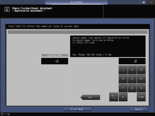Touch panel - Utility/Counter - [Administrator Setting] - [System Setting] - [Expert Adjustment] - [Finisher Adjustment] - [Staple Finisher Adjustment] - [Staple Finisher(Punch) Adj.] - [Registration Adjustment] | |||