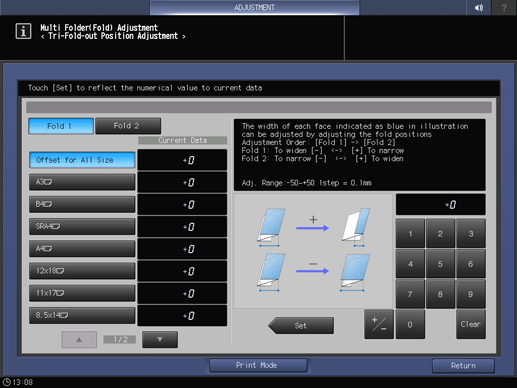 Screen access | Touch panel - [MACHINE] - [Adjustment] - [Finisher Adjustment] - [Multi Folder Adjustment] - [Multi Folder(Fold) Adj.] - [Tri-Fold-out Pos. Adj.] | ||