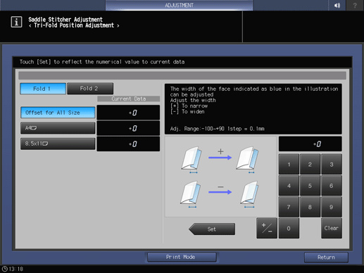 Screen access | Touch panel - [MACHINE] - [Adjustment] - [Finisher Adjustment] - [Saddle Stitcher Adjustment] - [Tri-Fold Position Adj.] | ||