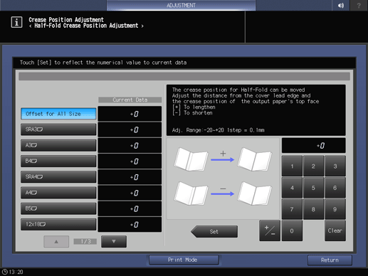 Control panel - Utility/Counter - [Administrator Setting] - [System Setting] - [Expert Adjustment] - [Finisher Adjustment] - [Saddle Stitcher Adjustment] - [Crease Position Adjustment] - [Half-Fold Crease Position] | |||