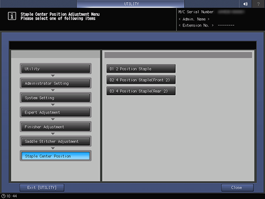 Control panel - Utility/Counter - [Administrator Setting] - [System Setting] - [Expert Adjustment] - [Finisher Adjustment] - [Saddle Stitcher Adjustment] - [Staple Center Position]
