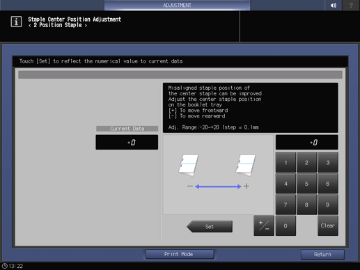 Screen access | Touch panel - [MACHINE] - [Adjustment] - [Finisher Adjustment] - [Saddle Stitcher Adjustment] - [Staple Center Position] - [2 Position Staple] | ||