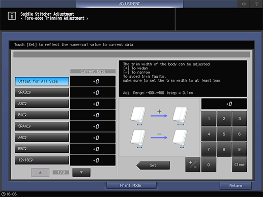 Control panel - Utility/Counter - [Administrator Setting] - [System Setting] - [Expert Adjustment] - [Finisher Adjustment] - [Saddle Stitcher Adjustment] - [Fore-edge Trimming Adj.] | |||