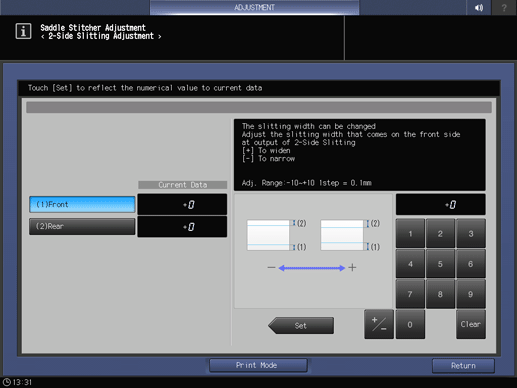 Screen access | Touch panel - [MACHINE] - [Adjustment] - [Finisher Adjustment] - [Saddle Stitcher Adjustment] - [2-Side Slitting Adjustment] | ||