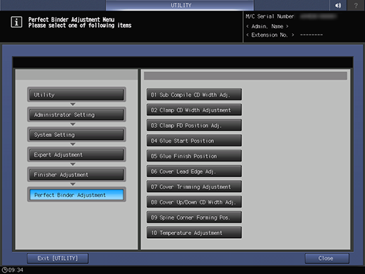 Control panel - Utility/Counter - [Administrator Setting] - [System Setting] - [Expert Adjustment] - [Finisher Adjustment] - [Perfect Binder Adjustment]