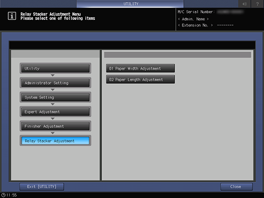 Control panel - Utility/Counter - [Administrator Setting] - [System Setting] - [Expert Adjustment] - [Finisher Adjustment] - [Relay Stacker Adjustment]