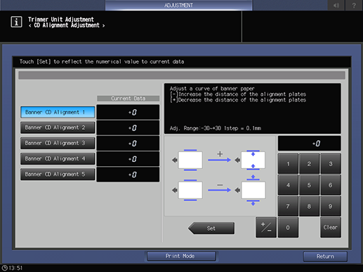 Control panel - Utility/Counter - [Administrator Setting] - [System Setting] - [Expert Adjustment] - [Finisher Adjustment] - [Trimmer Unit Adjustment] - [CD Alignment Adjustment] | |||