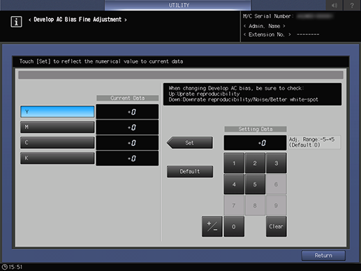 Screen access | Control panel - Utility/Counter - [Administrator Setting] - [System Setting] - [Expert Adjustment] - [Process Adjustment] - [Develop AC Bias Fine Adj.] | ||