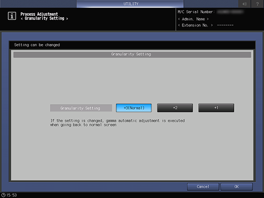 Screen access | Control panel - Utility/Counter - [Administrator Setting] - [System Setting] - [Expert Adjustment] - [Process Adjustment] - [Granularity Setting] | ||