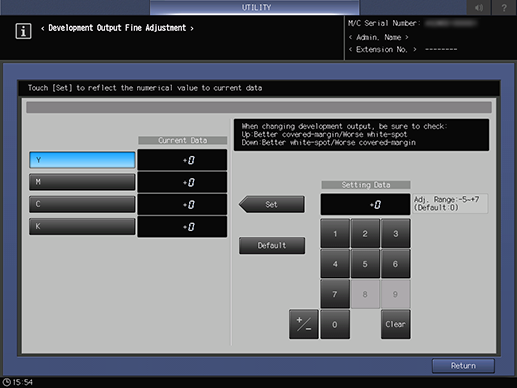 Screen access | Control panel - Utility/Counter - [Administrator Setting] - [System Setting] - [Expert Adjustment] - [Process Adjustment] - [Development Output Fine Adj.] | ||