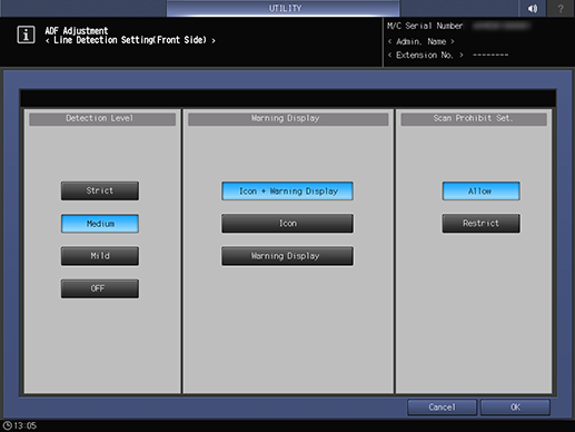 Control panel - Utility/Counter - [Administrator Setting] - [System Setting] - [Expert Adjustment] - [ADF Adjustment] - [Line Detection(Front Side)]