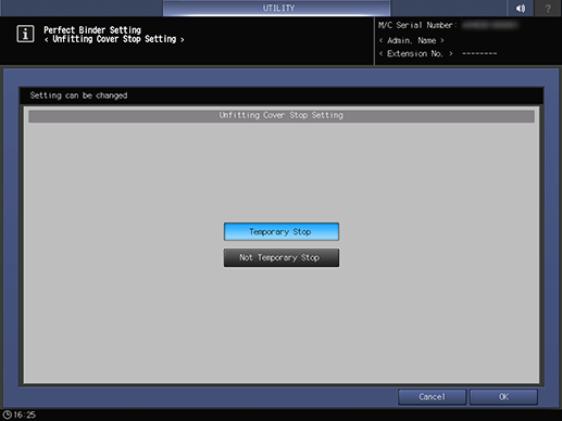 Control panel - Utility/Counter - [Administrator Setting] - [System Setting] - [Perfect Binder Setting] - [Unfitting Cover Stop]