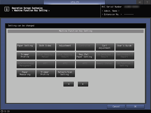 Control panel - Utility/Counter - [Administrator Setting] - [System Setting] - [Operation Screen Customize] - [Machine Function Key Setting]