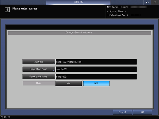 Control panel - Utility/Counter - [Administrator Setting] - [Scan Address Register] - [Address Edit] - [E-mail] - [Change]