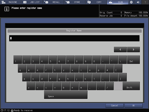 Touch panel - [SCAN] - [E-mail] - [Register/Edit] - [Add] - [Register Name] | |||