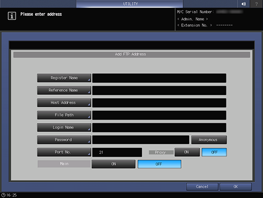 Control panel - Utility/Counter - [Administrator Setting] - [Scan Address Register] - [Address Edit] - [FTP] - [Add]