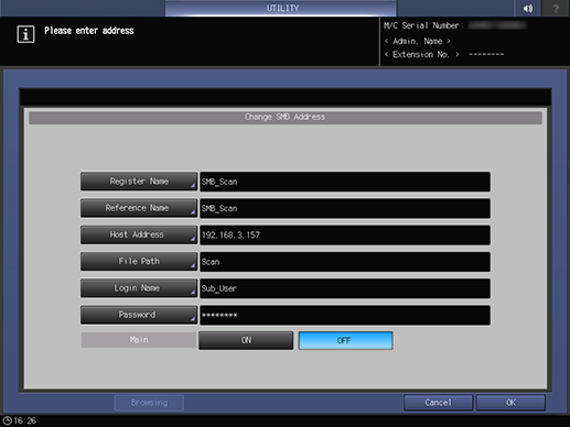 Control panel - Utility/Counter - [Administrator Setting] - [Scan Address Register] - [Address Edit] - [SMB] - [Change]