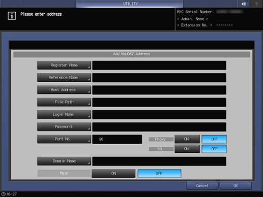 Control panel - Utility/Counter - [Administrator Setting] - [Scan Address Register] - [Address Edit] - [WebDAV] - [Add]