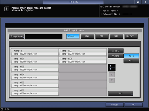 Control panel - Utility/Counter - [Administrator Setting] - [Scan Address Register] - [Address Edit] - [Group] - [Add]