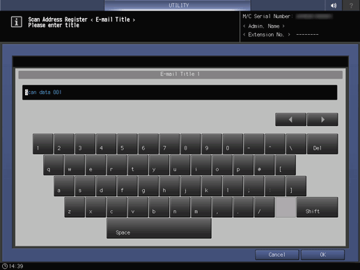 Control panel - Utility/Counter - [Administrator Setting] - [Scan Address Register] - [E-mail Title Setting] | |||