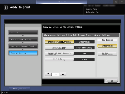 Control panel - Utility/Counter - [Administrator Setting] - [User Auth./Account Track] - [General Settings] - [Synchronize User Authen-tication & Account Track]