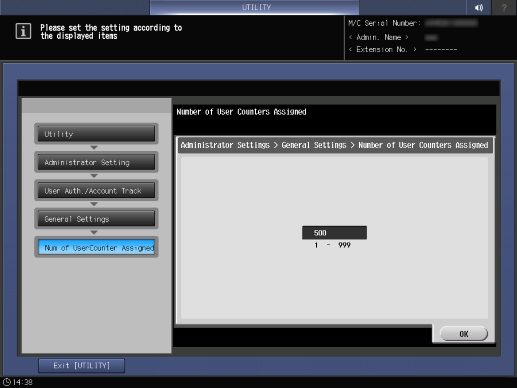 Screen access | Control panel - Utility/Counter - [Administrator Setting] - [User Auth./Account Track] - [General Settings] - [Number of User Counters Assigned] | ||
