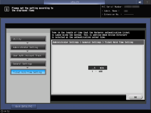 Setting items | [Ticket Hold Time Setting] | Sets the expiration date of the authentication ticket. Range: 1 minute to 600 minutes Default: 5 minutes | |