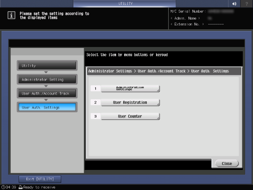 Control panel - Utility/Counter - [Administrator Setting] - [User Auth./Account Track] - [User Authentication Settings]