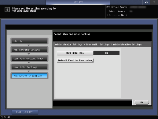 Control panel - Utility/Counter - [Administrator Setting] - [User Auth./Account Track] - [User Authentication Settings] - [Administrative Setting]