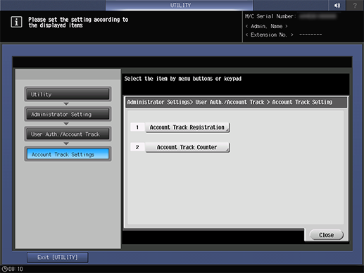 Control panel - Utility/Counter - [Administrator Setting] - [User Auth./Account Track] - [Account Track Settings]