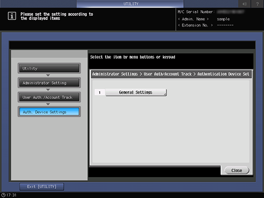 Control panel - Utility/Counter - [Administrator Setting] - [User Auth./Account Track] - [Authentication Device Settings]