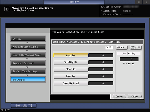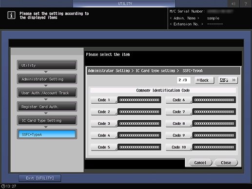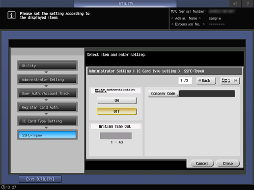 Control panel - Utility/Counter - [Administrator Setting] - [User Auth./Account Track] - [Authentication Device Settings] - [General Settings] - [Rgister Card Auth.] - [IC Card type setting] - [SSFC+Type A]