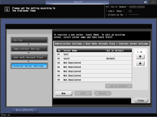 Control panel - Utility/Counter - [Administrator Setting] - [User Auth./Account Track] - [External Server Settings]