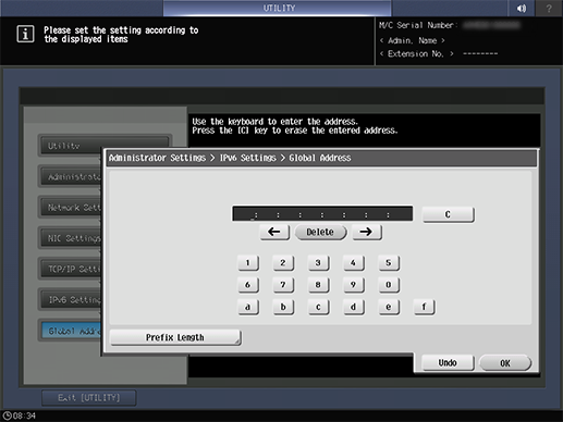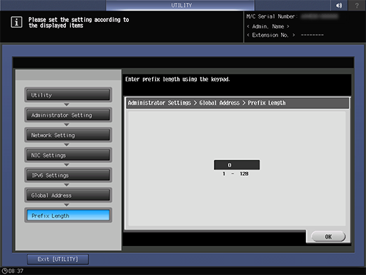 Screen access | Control panel - Utility/Counter - [Administrator Setting] - [Network Setting] - [NIC Settings] - [TCP/IP Settings] - [IPv6 Settings] | ||
