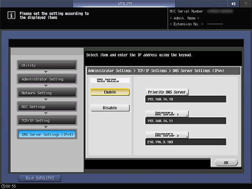 Control panel - Utility/Counter - [Administrator Setting] - [Network Setting] - [NIC Settings] - [TCP/IP Settings] - [DNS Server Settings (IPv4)]